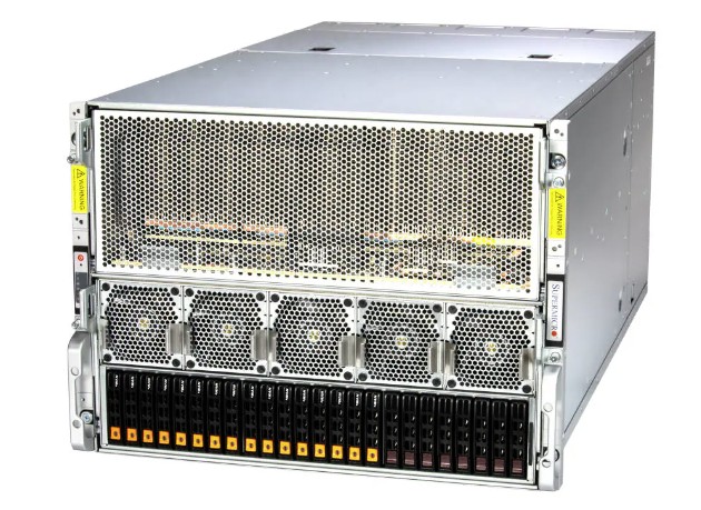 Boost AI, HPC, and data-intensive workloads with this high-density 8U server featuring 8x AMD Instinct MI300X GPUs and direct GPU-to-GPU RDMA with 1:1 NIC ratio. It supports up to 24 DDR5 DIMMs at 6000MT/s, delivering up to 6TB memory capacity. Flexible PCIe 5.0 expansion includes 8x x16 LP and up to 4x x16 FHFL slots, while storage options include 16 hot-swap NVMe drives, 2 SATA bays, and an M.2 boot drive. Ten heavy-duty fans ensure optimal cooling, and six 3000W (3+3) Titanium redundant power supplies provide enterprise-grade reliability.